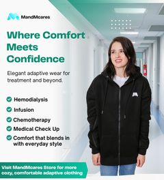 Stay warm, comfortable, and treatment-ready with the MandMcares adaptive hoodie. Thoughtfully designed with smooth bilateral arm zippers, it provides easy access for hemodialysis, chemotherapy, and infusion treatments—without ever sacrificing warmth or dignity.