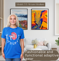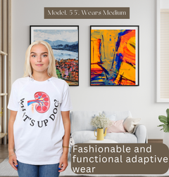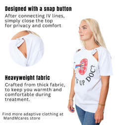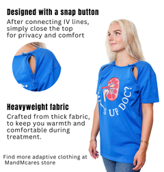 This product features extra snap buttons on top of the zippers, making it effortless to release the line and providing maximum coverage for shoulders. You don't have to sacrifice fashion for medical treatments, this shirt says it all with a cheeky catchphrase on the front. The two side zippers on the chest allow for easy access to ports without exposing your chest. It's a great gift for those going through dialysis or fighting cancer, offering both comfort and convenience with style in mind.